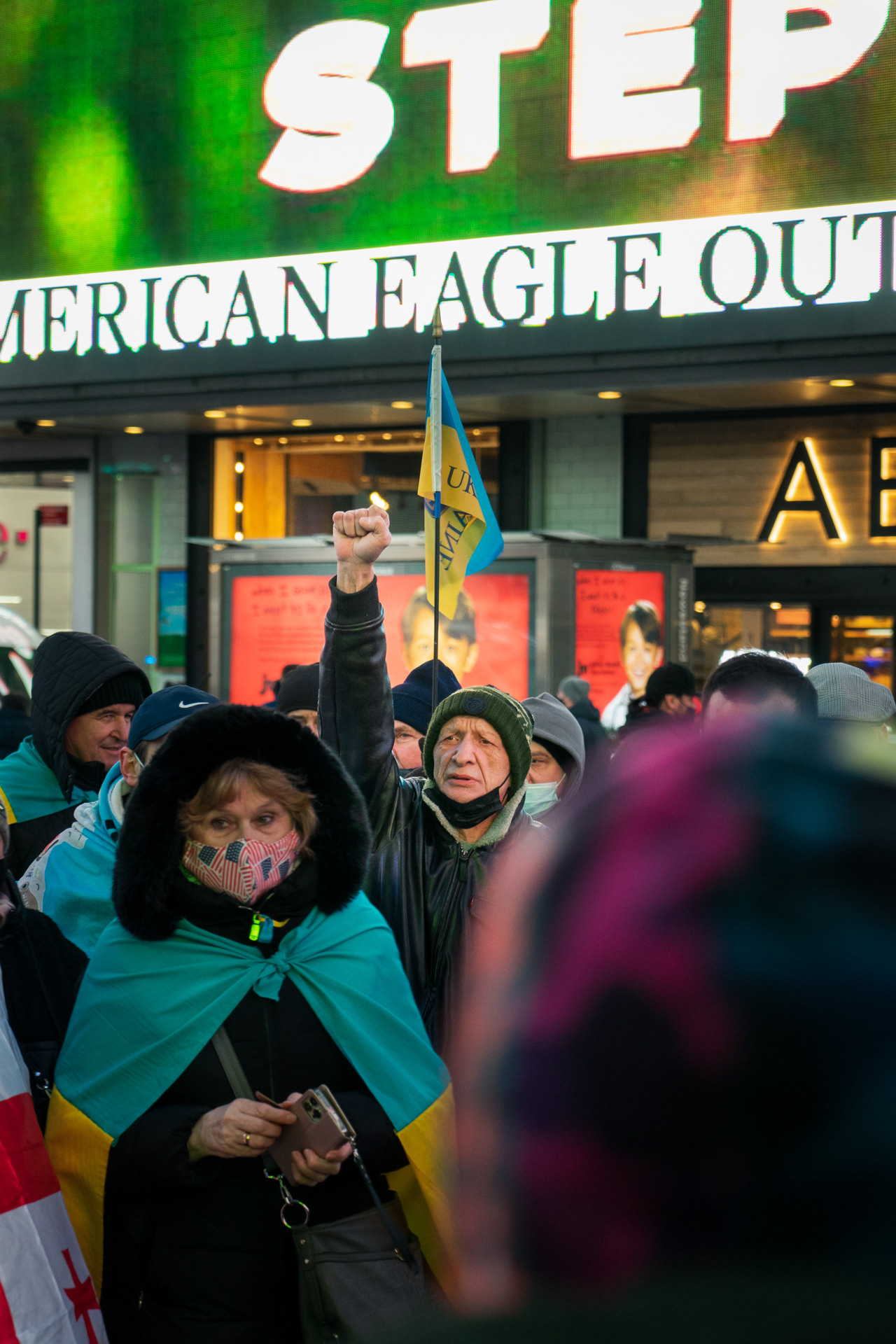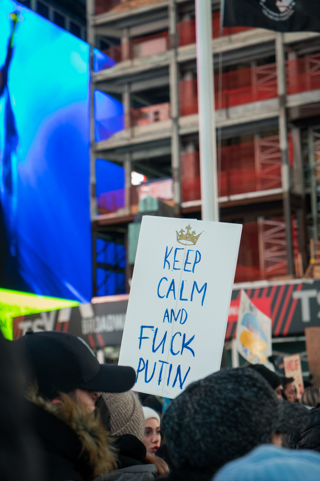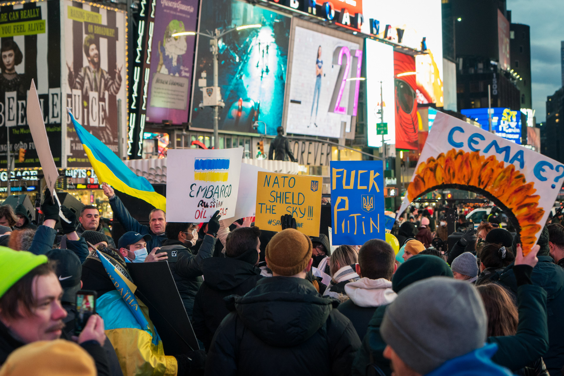 Een protest op Times Square in New York aan het begin van de oorlog.