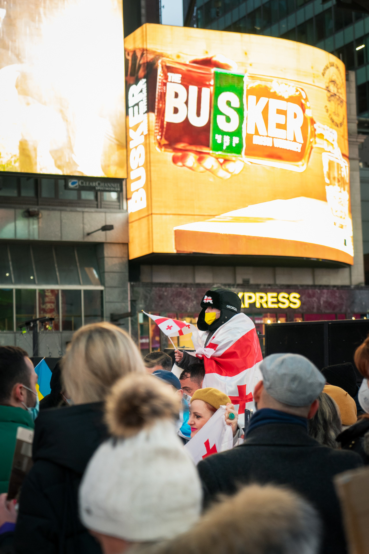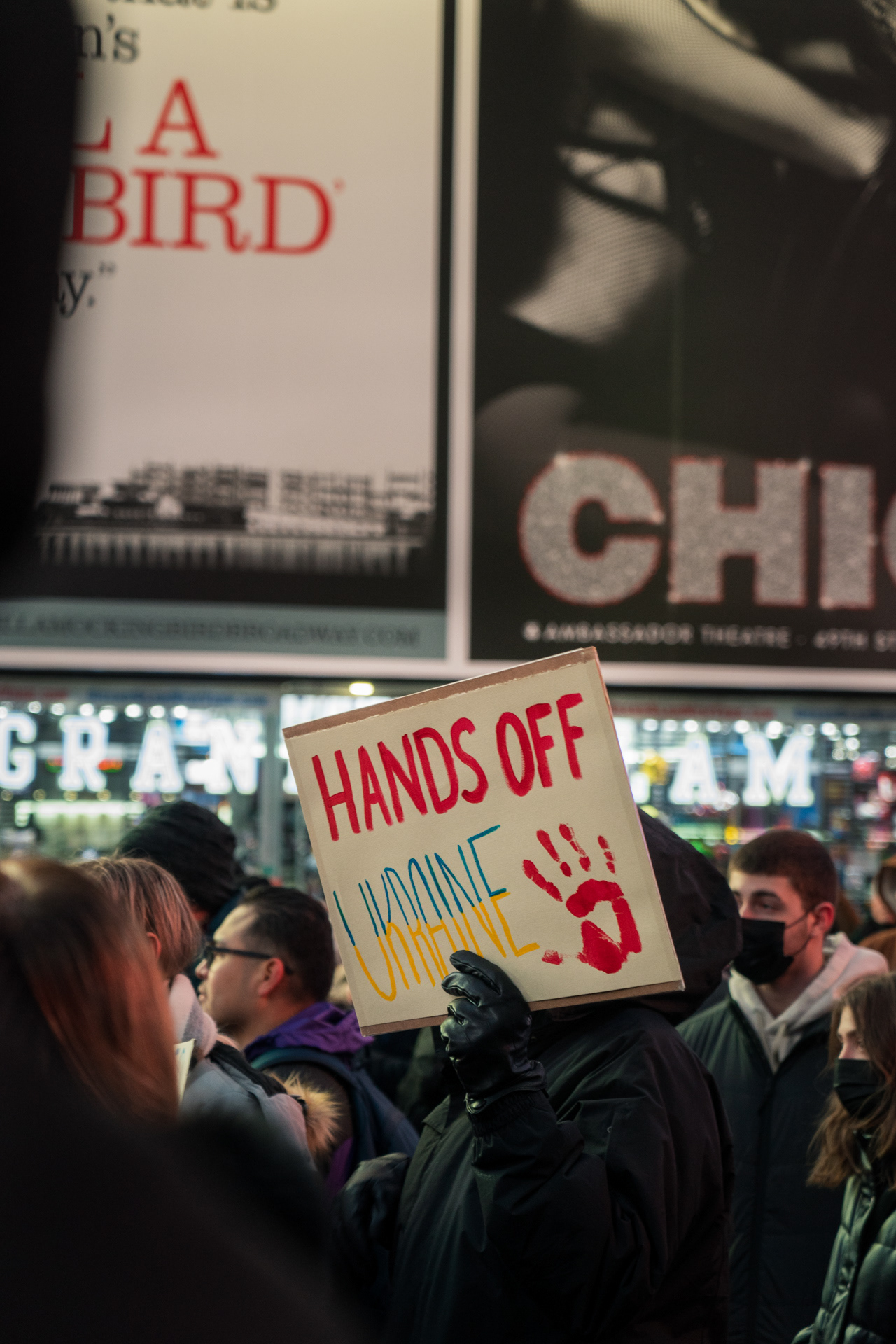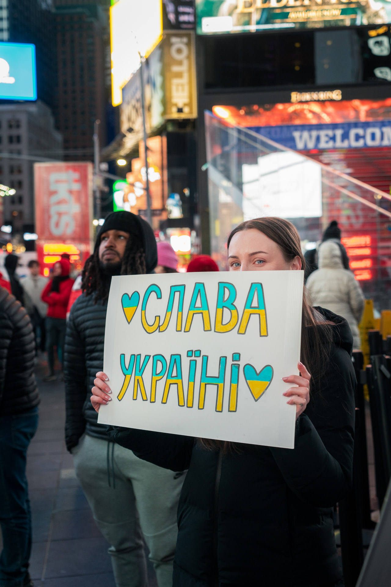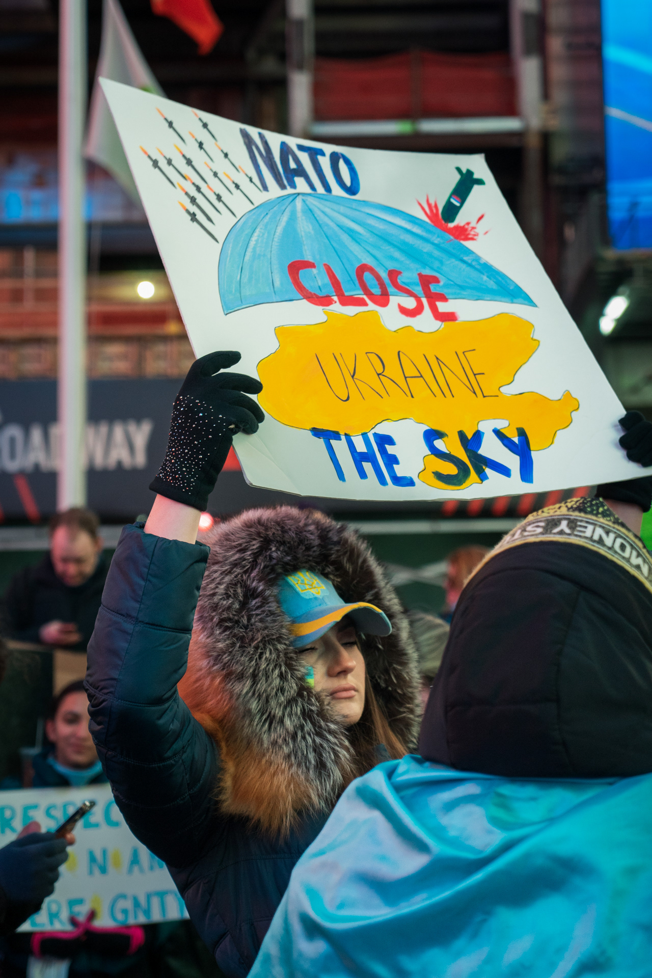 Een protest op Times Square in New York aan het begin van de oorlog.